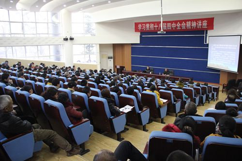12月29日下午,学院举行学习贯彻十八届四中全会精神报告会。学院邀请了学习贯彻十八届四中全会精神和省委十届五次全会精神省委宣讲团高校宣讲分团特聘专家、四川师范大学法学院陈驰教授作学习辅导报告。学院中层以上干部、副高以上职称教职工、思政课教师、学生代表等340余人聆听了报告。报告会由党委副书记黄天贵主持。