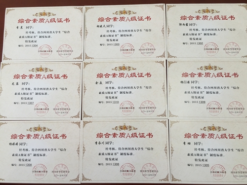 3月底,院团委认真部署积极宣传,申报工作有序开展。经各系申报,院团委严格审核,共推荐12名同学,团省委、省学联终审确定我院龙藤等9名同学顺利通过,取得2015年四川省大学生“综合素质A级证书”,这9名同学在校期间表现积极、锐意进取,均在学习、工作中获得多项荣誉称号,是广大学子的学习榜样。