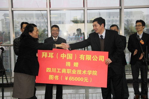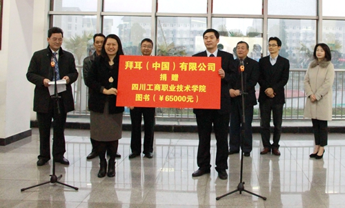 在捐赠仪式上,李春明院长表示,在中德政府强调加强合作的今天,学院正积极推进示范性高职院校建设,各方面的工作已经有了很大的进步,也得到德国领事馆的关注。我们与包括德国萨尔兰应用技术大学的合作正在积极的推进中,“中德(四川)中小企业合作交流平台”也正在积极的筹备中,学院正在迎来宝贵的发展机遇和新的里程碑;同样,中国政府推进的“一带一路”和“海上丝绸之路”开发战略也为世界爱好和平发展、有强烈责任感的企业提供了新的机遇,我们相信,拜耳公司在中国的事业会随着中国经济社会的发展而更加辉煌。