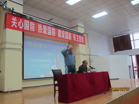 为增强国防意识,积极鼓励和引导大学生应征入伍,献身国防事业。3月7日下午,由都江堰市武装部、学院武装部组织以“关心国防、热爱国防、建设国防、保卫国防”为主题的国防知识进校园活动。参加活动的领导有学院党委书记管永林,武装部政委李春华,武装部部长杨军,党委副书记、学院武装部部长黄天贵等,全院各系书记、辅导员,班干部、有意愿入伍的学生积极分子。此次活动特邀成都市国防教育学会讲师团张振东教授作《国防建设与军事改革》国防知识讲座,张教授从中国的兴衰史和我军发展史出发,深刻阐述了国防建设的重要性。他说,在科技进步日新月异的今天,国家的进步发展,要靠强大的国防作保证,而强大的国防需要以高新科技人才为基础,他希望同学们以国家进步为己任,认真学习,刻苦锻炼,早日成为国家建设、国防建设的有用人才。张教授还对当前的国际、国内形式进行了分析,使我们受益匪浅。