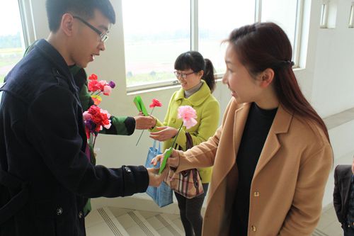 中午12时,女生部的同学们早已等候在食堂三楼,她们面带微笑,为每一位到来的女教师送上节日的小礼物和祝福。当教师们看到精心准备,写满祝福语的卡片和手工艺花的时候,都有一份暖意回荡在心间。