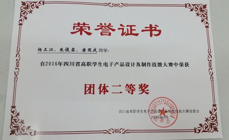 4 月17日 ,2016年“质肇杯”四川省高职院校电子产品设计与制作技能大赛在成都纺织高等专科学校举行。我院机电系由吴琦、张娜、罗明凤三位老师指导的电子信息工程技术专业朱俊霖、杨正江、唐国庆、余伟、王波、陈亮6名同学组队参加了本次竞赛。