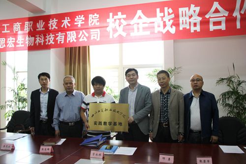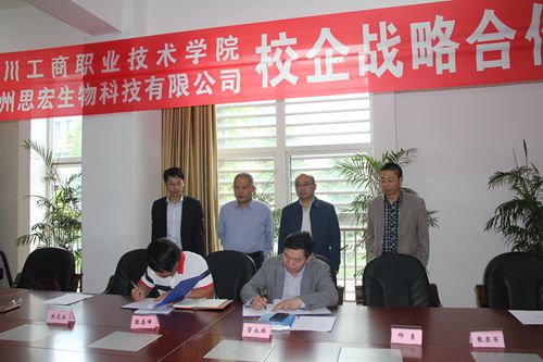 ,我院与广东思宏生物科技有限公司校企战略合作协议签约仪式在行政楼二楼会议室举行。我院党委书记管永林,酒类与食品工程系、产学合作中心负责人,广东思宏生物科技有限公司品牌总监、我院杰出校友张高峰出席了签约仪式。仪式由酒食系朱克永主任主持,管永林书记和张高峰总监分别代表校企双方在协议书上签字。随后,校企合作双方举行了“四川工商职业技术学院实践教学基地”授牌仪式。
