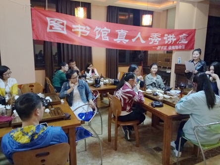晚,由图书馆主办的真人秀系列活动之主题讲座——“青城道茶、图书馆茶文化书目推介绍与茶艺表演”,在图书馆7楼举行。讲座由图书馆王俊芳主持,管理系雷清美主讲,航空专业刘榆和张茂作茶艺介绍和茶艺表演。通过现场边介绍茶艺边进行的茶艺表演,让大家认识了茶艺中使用的器皿,通过不同环节诸如看茶色,闻茶香,泡茶过程以及最后的品茶,第一次近距离感受茶文化的妙处,对泡茶品茶产生了浓厚的兴趣,除了看书了解更希望去管理系培训一下自己的茶艺。
