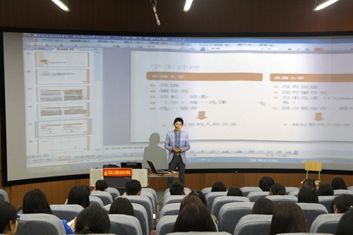 下午,课程录播室举行。讲座中,李成思博士通过对比中美宿舍,校园以及教育管理的方式来告诉同学们中美大学以及文化之间的差异,特别说明了美国教育中终身学习和触类旁通的学习目的,对同学们的学习给予了鼓励与帮助。李博士的讲解生动有趣,现场的同学们都在专心致志的听讲,对中美文化的差异很是感兴趣。