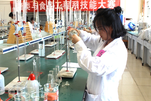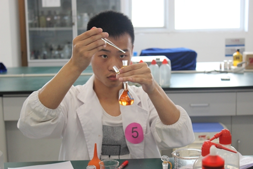 决赛分为滴定分析和仪器分析两大类。选手随机抽取实验类别进行实验。比赛分别在分析化学实验室进行EDTA浓度标定实验,分光光度实训室进行水中铁离子含量测定。比赛一开始,所有选手立即进入紧张认真的答题状态,集中精力思考每一步骤。选手们运用自己所学到的知识,严格按照实验室要求进行操作。评委们则紧随选手,仔细地观察,看选手的操作是否规范、仪器的使用是否正确。最终,评委依据选手的实验操作、成品与效果等进行了综合评分。本次技能比赛中“理论与实践相结合”是一个重要的考察点,意在考察学生在实验准备、实验原理、实验操作规范、实验结果观察与分析等方面的能力。