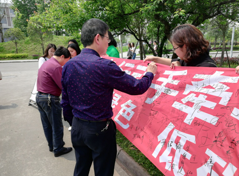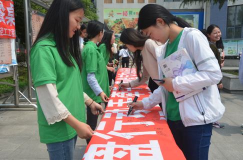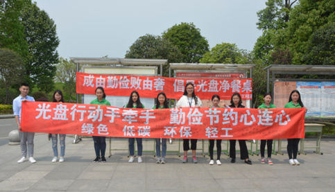 4月19日,由轻工工程系环保协会组织环保志愿者举办的“光盘行动手牵手勤俭节约心连心”的光盘行动签字活动在学校广场举行。