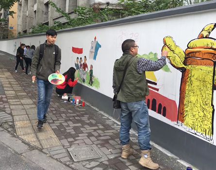 从4月初起,设计艺术系17级学生缪竺娟、李玉等8名同学在王晓高老师的带领下,先后在崇州市锦江乡天民村、奎光塔街道龙潭湾社区等地进行 “社会主义核心价值观”“美食文化”“都江堰名人录” 等主题的墙体美化涂鸦。