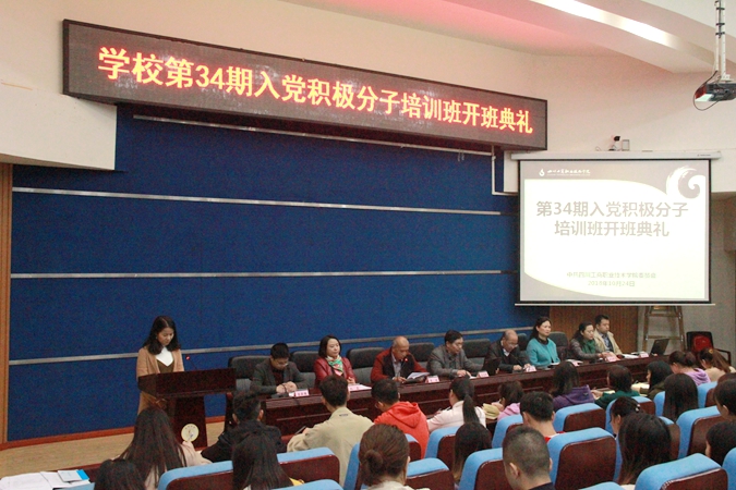 在全校上下深入学习贯彻习近平新时代中国特色社会主义思想、党的十九大精神,学习贯彻省委十一届三次全会精神以及学校第三次党代会精神之际,10月24日晚,学校第34期入党积极分子培训班在学术报告厅开班。参加开班典礼的有252名参训学员、校党委书记管永林,党委副书记、业余党校校长黄天贵,党委委员、党委组织部长李建以及各党总支副书记和学生党支部书记,党委组织部副部长李丹丹主持了此次开班典礼。