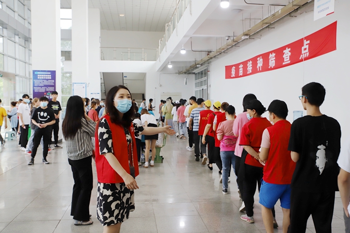 “打疫苗这边先登记”“要带上身份证”“请到这边排队” “请耐心等待,速度很快”,这是5月13日在学校素质拓展馆,都江堰疾控中心的医护人员为全校的师生员工开展新冠疫苗的接种现场,身穿红色马甲的机关第一党支部党员志愿者们挂在嘴边的话语。