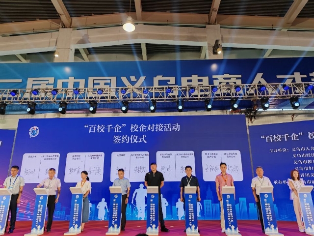 在第二届中国义乌电商人才节系列活动启动仪式上,人力资源和社会保障部全国人才流动中心、浙江省人力资源和社会保障厅、义乌市委书记、中国电子商会、产教融合专委会等领导共同为启动仪式推杆启动。王银桃主任代表学校与义乌市人力资源和社会保障局签订校政合作协议书。在“百校千企”校企对接活动上,王银桃主任代表学校与浙江零远科技有限公司等十余家义乌企业签署校企合作协议,为毕业生开拓近千个就业岗位。