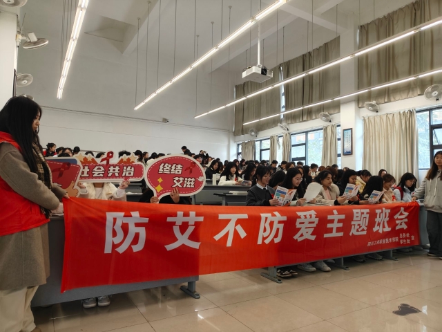 12月的第一周,全校所有班级开展了“防艾不防爱”主题班会。各班结合学情实际,举行观看防艾视频、专题讲座、学习心得讨论等形式多样的防艾活动。防艾志愿者还深入班级,为同学们宣讲普及禁毒防艾、性教育等相关知识,发放大学生防艾手册和校园内免费领取安全套、HIV自检试剂指南等资料。