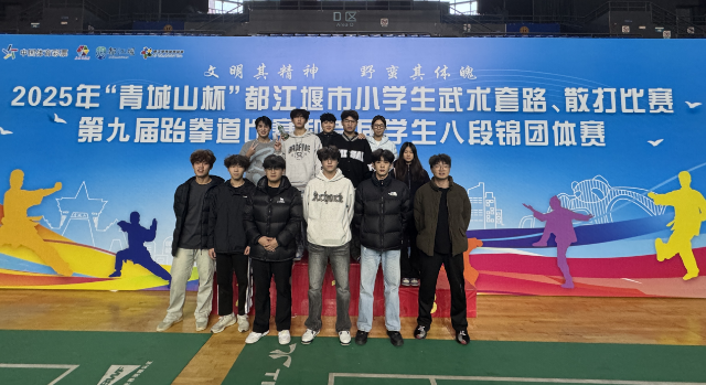 11月8日至10日,2025年“青城山”杯都江堰市小学生武术系列赛事在都江堰市飞龙体育馆火热开赛。我院24级社会体育专业12名学生受邀参与赛事的组织与策划工作。