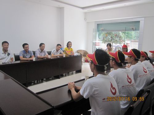 随后,社区领导周主任在会议室热情地接待了王助理一行,并召开交流会议。会议上,周主任首先对轻化工程系志愿者们近段时间的工作给予了最高的评价,社区十分感谢志愿者们的辛勤劳动。然后,由轻化工程系“三下乡”社会实践小队队长黄笳能作了工作汇报,志愿者们针对社区实际情况,在社区开展了城乡环境综合治理、文明劝导、开展院落活动,在都江堰景区和社区开展问卷调查,在公园与老人们齐唱红歌,为幼儿园的小朋友带去快乐,为福利院的老人们带去欢声笑语,为客运中心的旅客带去舒心与方便等等。听完队长的汇报,王开淮助理对志愿者们的工作十分满意。他代表学校感谢社区负责人为志愿者们提供良好的活动场所以及对活动的大力支持,对同学们牺牲暑期休息时间来参加志愿者活动的行为表示赞赏,并且希望志愿者们在以后的活动中要以饱满的热情,持之以恒的精神完成各项任务。