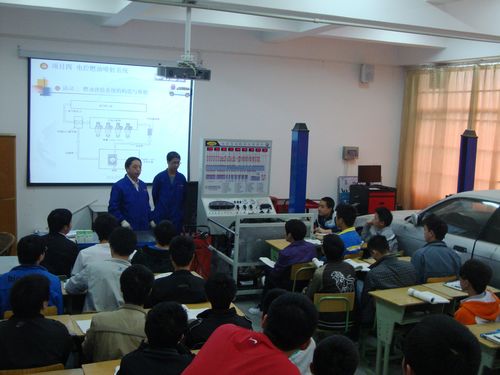 机电系汽车专业综合实训室内目前利用有限的空间初步建立了理实一体化教室,教室分为两部分,一部分为课堂教学教室,另一部分为实训工作室。通过一体化教学,积极探索建设一支理论扎实、实践能力强的高技术应用性人才队伍。