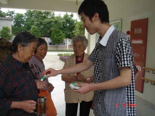 早上8点30分,志愿者们带上自己的心意到了敬老院。首先慰问了在花园里散步的老人。志愿者送给老人风油精和清凉油用于防暑,并给老人传授夏季防暑小知识。