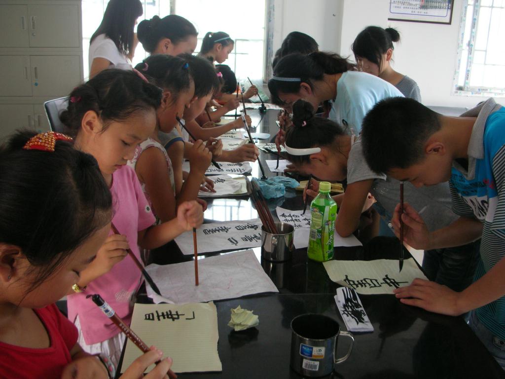 天气是一天比一天热了,小孩子们的积极性也和天气一样在变化。 我们这次三下乡真的为小朋友们带来了一次很好的“第二课堂”,今天我们“温馨之家”又迎来了三个小朋友,好多家长一听说三下乡就把自己的孩子带来报名了。每天小同学们还是很早的就到活动室门口等着“老师们”到来,并依次排好队等老师点名。天气太热我们也担心小孩子们的身体但他们的积极性还是很高,每天不管天气多热都耐心的等着。经过了上课的调整虽然每次上课人数少了可是教室里还是很热,我们也在尽量的解决这个问题,让孩子们有个更舒适的学习环境。针对这些情况我们从学习书法的同学中学选了了些比较好的开设了“书法兴趣班”,将这些同学又安排到另外的教室上课,这样教室的负担又减轻了。  书法兴趣班  户外拓展游戏 每天孩子们特别期待开展素质拓展游戏,这个课程我们是为了培养孩子们团队协作精神,思维方式等多方面的综合能力。每天我们考虑到天气原因也相应的减少了教学的安排量,劳逸结合,让孩子们更好的学习。 小孩子淘气、童真还让我们每一个队员感动,天热也只能增加我们对他们培养的热情,爱在成长,我们深信孩子们通过我们的教学,在综合素质方面一定有不少的长进,我们也迈着坚定的步伐迎接更大的挑战!