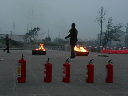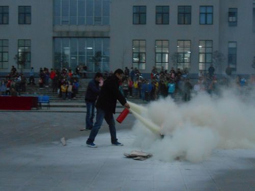 活动中,院综治部安排了一些关于宣传消防知识的精彩节目,并在活动现场找了10位同学上台演练怎样使用灭火器。接着,综治部的干事将两个油盆里的干树枝倒上汽油,点燃油盆里的火后,在李处长指导下10名同学成功的将火盆中的火焰熄灭。