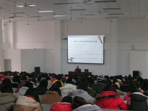 讲座在同学们热烈的掌声中拉开了帷幕。青明英老师首先为大家讲了关于会计职业的认知和行业状况,同学们都津津有味地听着,脸上呈现出兴奋与迫不及待地想要知道更多知识的表情。随后她讲了财会人员面临的问题,同学们应如何成为优秀的财务管理型人才,以后走上工作岗位应该用怎样的一种态度对待自己的这份职业,以及怎样加强自己对环境适应的能力、综合能力、领导能力等。她还为大家讲了会计人员必须经过的几个过程以及自己的心得体会。作为会计人员,一定要有责任心,必须养成严格要求自己、坚持原则的好习惯。发挥思维能力、提炼有价值的信息。要将理论与实践结合起来,并对自己岗位要有新的认识和建议,自发性的利用业余时间来学习、思考。最后,罗风巢老师简单总结了本次讲座的重点内容。