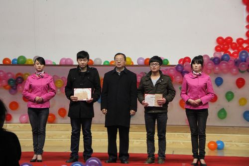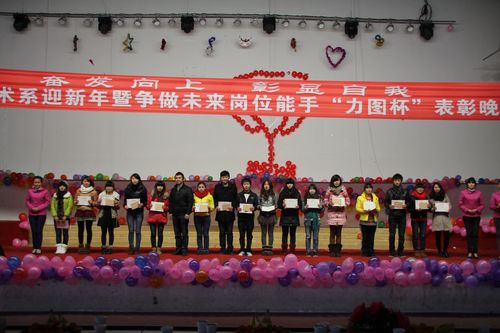 营造更好的学习气氛,丰富同课外活动。设计艺术系于20121229日下午在学院素质拓展馆举行了“奋发向上、彰显自我”迎新年暨争做未来岗位能手“力图杯”表彰大会 。学院领导孙培生、黄天贵长助理王开淮,学生处处长梁正席以及负责同志和力图公司岳总出席大会并为艺术系获奖同学颁发证书和奖金