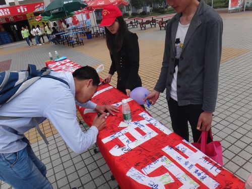 4月22日中午,轻工系宣传部在校园中心广场举行万人签名承诺活动,号召同学们参与环保,与环保同行。活动现场师生们纷纷驻足,在印有“保护地球 人人有责”的红色条幅上郑重签上自己的名字,以表达了对环保从我做起的承诺以及对美丽祖国的美好祝愿。