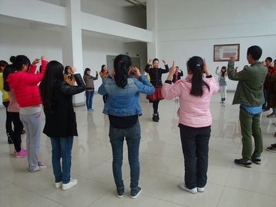 团体心理辅导一开始,在简单讲解后刘晓老师就带领同学们到教室外的空地开始放松活动。所有的同学手拉手围成一个大圆圈开始运动身体、放松心理。刘晓老师带领大家开始做起“手指操”。“手指操”不仅锻炼手指的灵活性,还能锻炼大脑和手指的协调性。在明快的节奏中,同学们在掌握技巧后开始加大难度,由一根手指变成一只手,再演变成两个同学合作完成“手指操”。现场的气氛在刘晓老师的带领下变得轻松、愉悦起来。