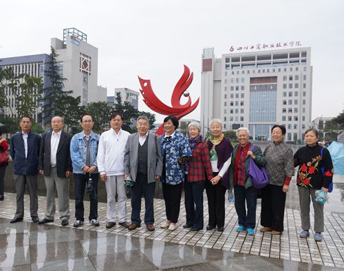 参观完老校区,老校友们又来到聚源新校区。看到一座座崭新的漂亮的建筑呈现在眼前,老人们无限感慨,他们回忆说当年他们进校读书的时候教室都是草房,用石头做桌子凳子,一个月都洗不了澡……现在的孩子们真的好幸福啊。老校友们在厚德广场合影留念,沿行健路在校区内参观,当来到学院陈列馆老校区校门的“四川省轻工业学校”挂牌前时,老校友都激动地与老校名挂牌合影留念。经过轻化实训中心时,老人们都高兴地说这就是我们以前的专业。
